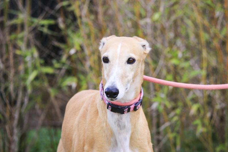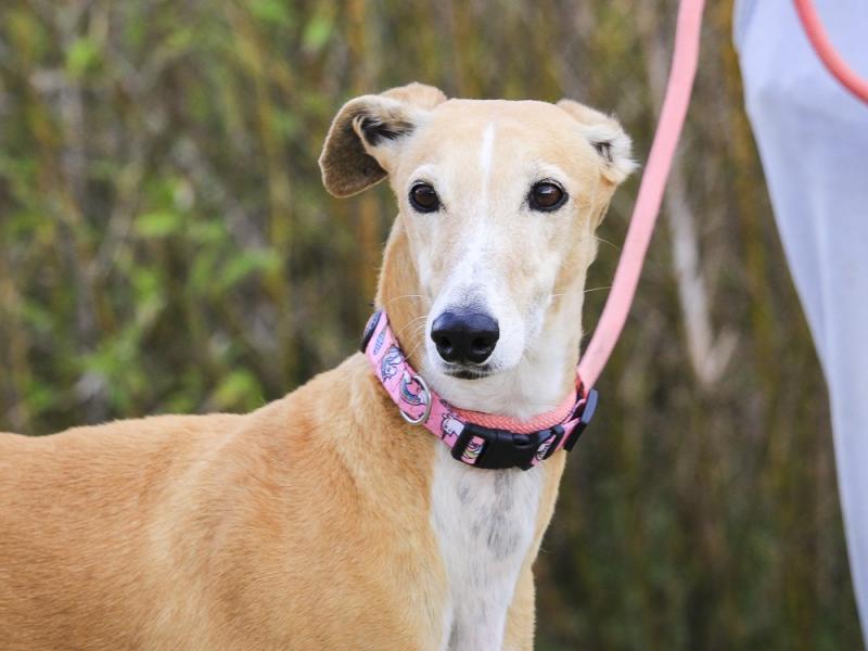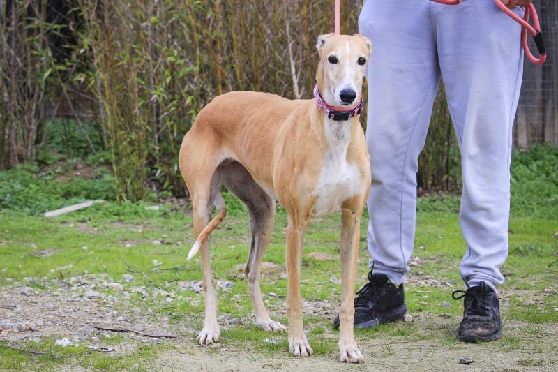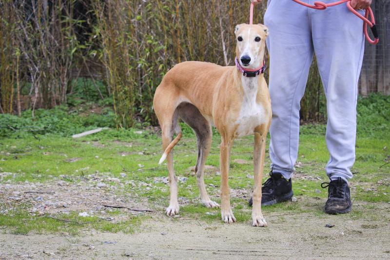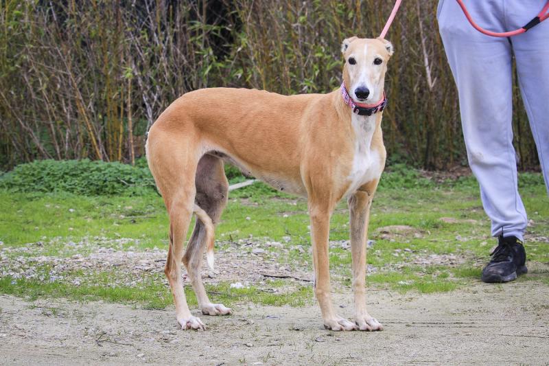 É uma cadela tímida mas muito simpática, precisa de paciência e de um lugar onde se sinta segura.